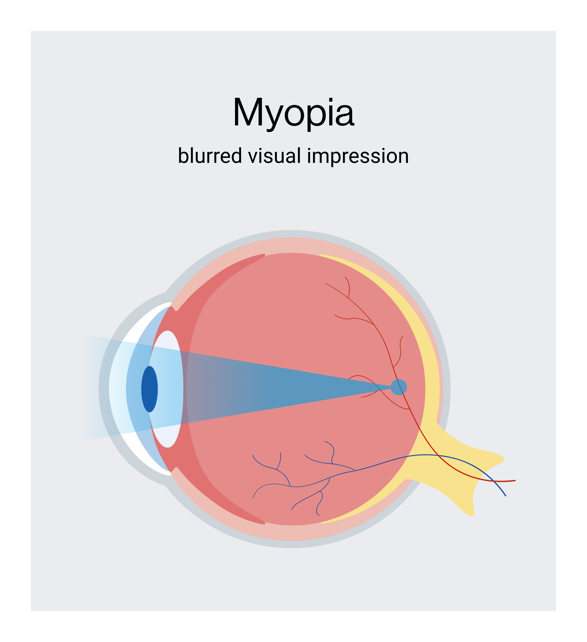 Compared to a normal-sighted, healthy eye, the eyeball is too long in people with myopia. The beams focused by the cornea and lens meet in front of the retina. Therefore, sharp vision is only possible at short distances. Objects in the distance are perceived as blurred. This visual defect is called myopia or short-sightedness. You can have laser treatment for short-sightedness!
