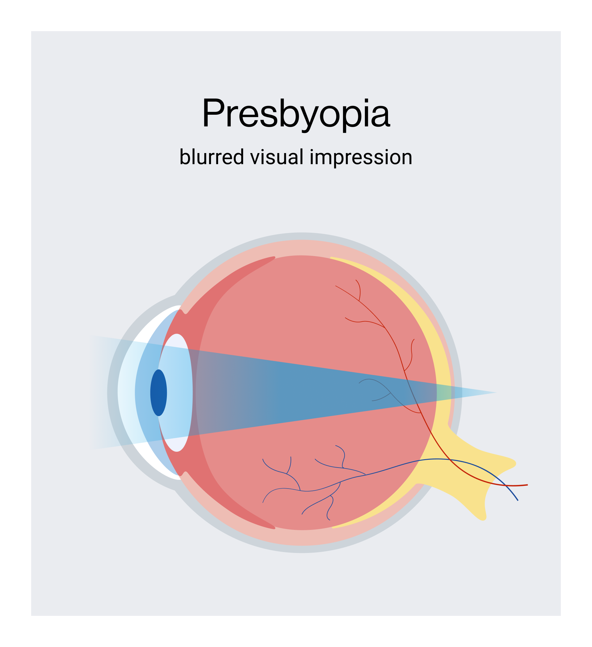 With presbyopia the lens loses flexibility and can no longer adjust to near objects (the ability to accommodate decreases — the lens’s refractive power is reduced). Again, light rays fall incorrectly on the retina and no sharp image is produced.